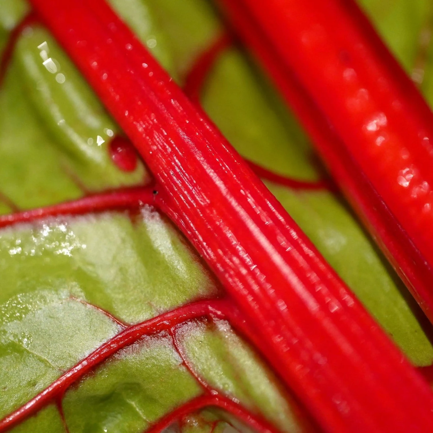 - Bright red stems with mild flavoured green leaves