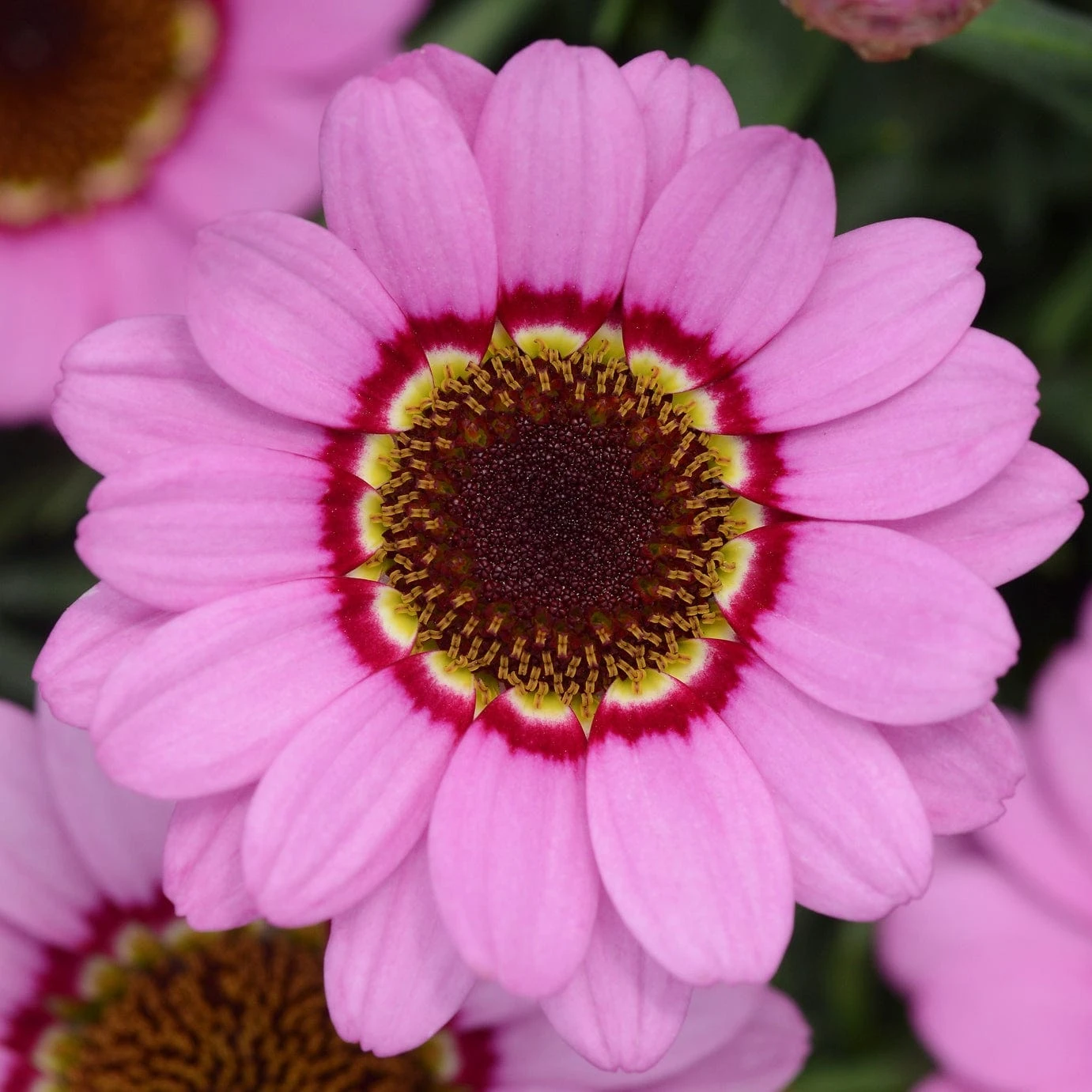 - Extra large daisy-like flowers (6cm wide) in beautiful Blush pink edged in Magenta, with a deep brown centre