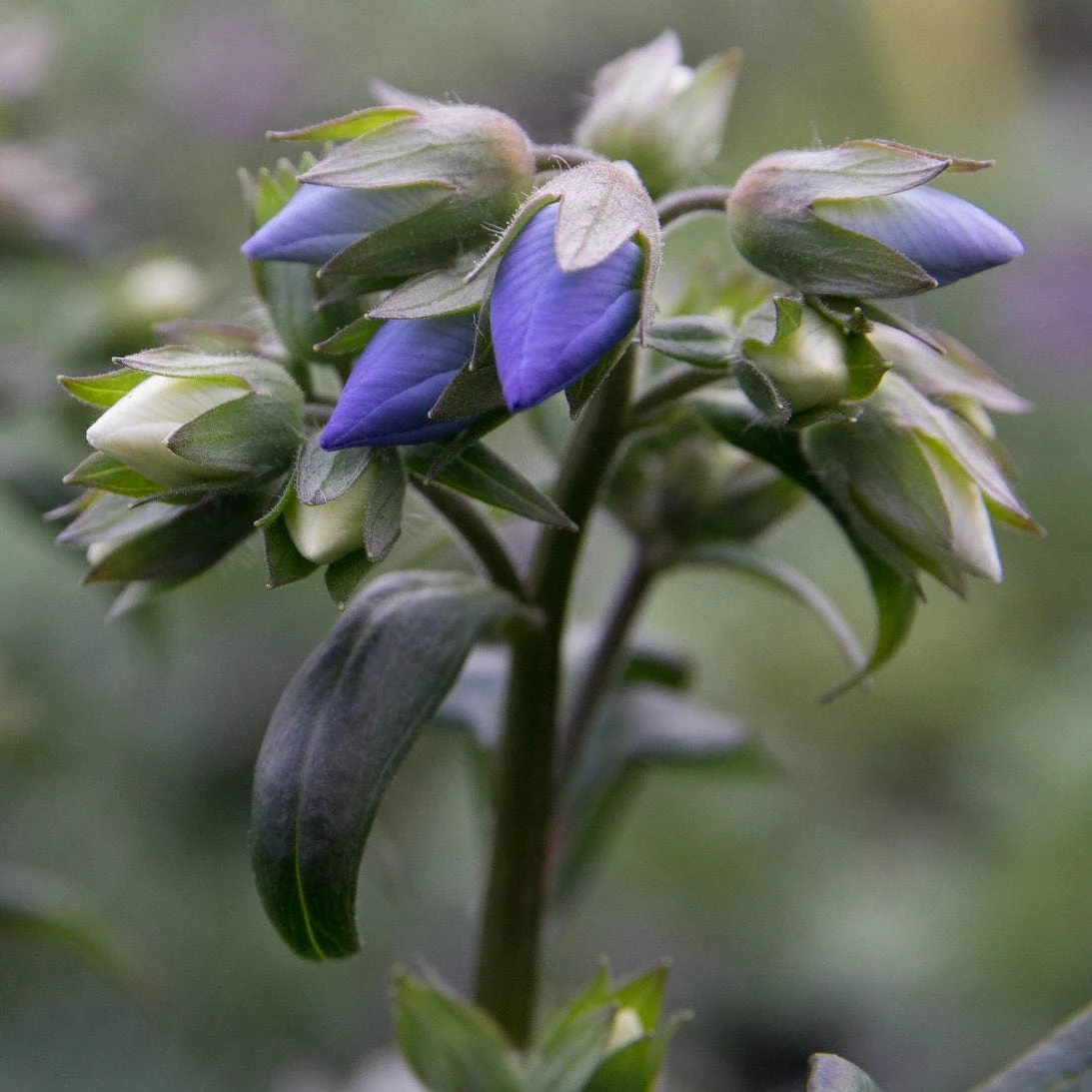 - Clusters of lavender coloured cup-shaped flowers with sunny yellow stamens on dark, almost purple leafy stems